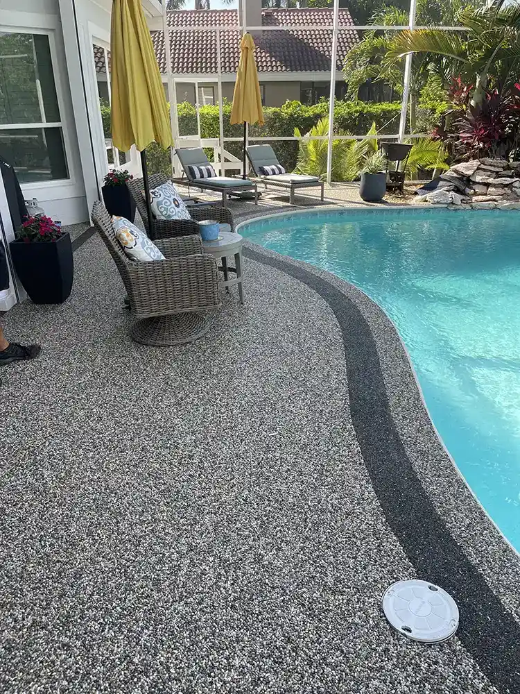 AquaFlex® Poured-in-place rubber, PebbleFlex® TPV Poured-in-Place Rubber, epoxy stone, and decorative epoxy flake systems for garages—offer durability, safety, and design flexibility. From pool deck resurfacing in Southwest Florida to splash pads and playground resurfacing in Florida resorts, we match materials to the environment for lasting performance.
